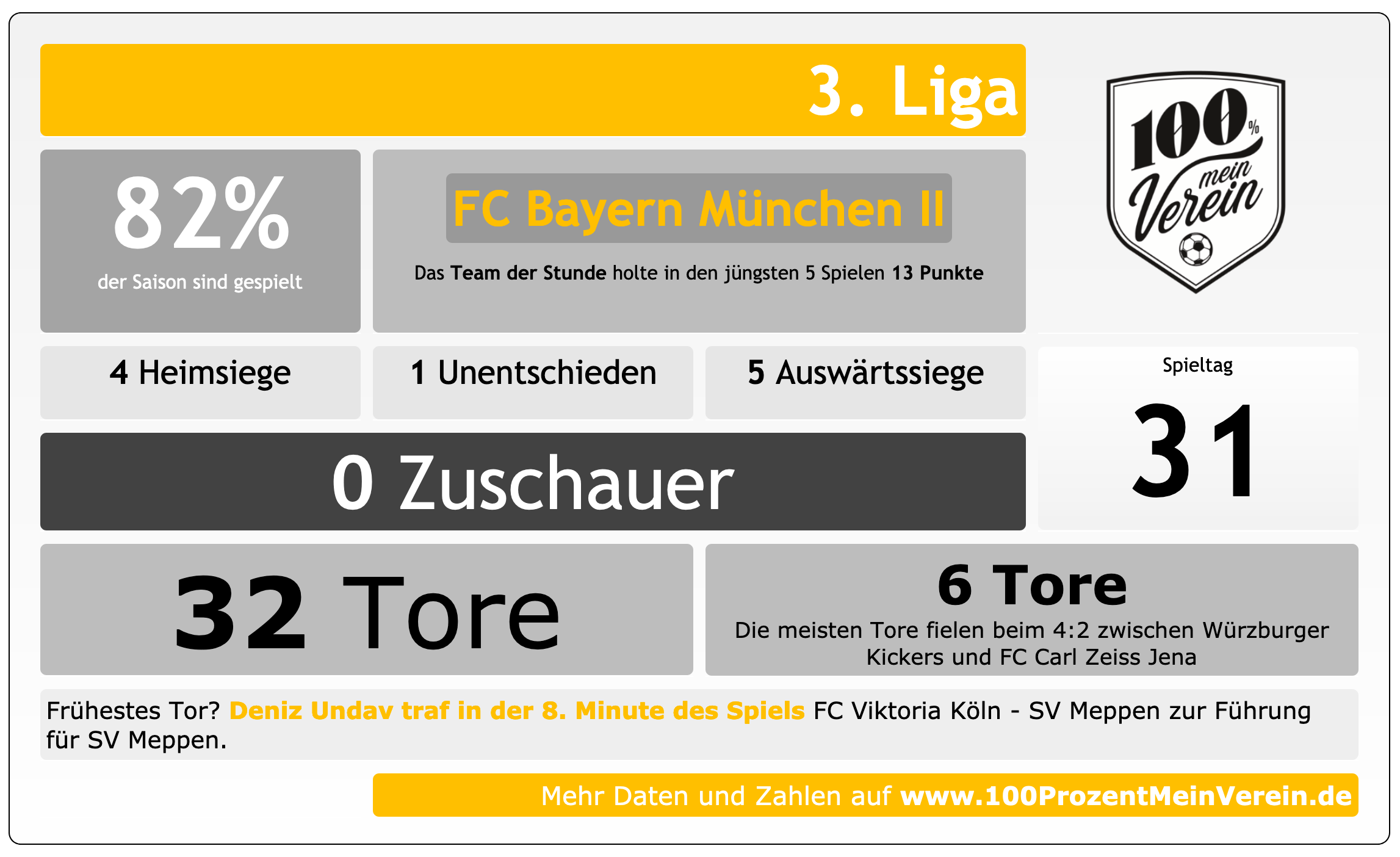 ![]() | 11.06.2020 FC Bayern München II ist das Team der Stunde - der 31. Spieltag im Überblick Der 31. Spieltag der 3. Liga ist abgeschlossen. Die irre Auswärtsserie des SV Waldhof Mannheim ist gerissen. In Halle unterlag der SVW mit 0:3 und verlor damit sein erstes (!) Auswärtsspiel seit dem Aufstieg in die 3. Liga ... Für Halles neuen Trainer Florian Schnorrenberg war es der perfekte Einstand. Das 1:3 in Rostock bedeutet dagegen für Magdeburgs Trainer Pele Wollitz das letzte Spiel. Er wurde entlassen. Mehr zum 31. Spieltag... Weiterlesen ... |